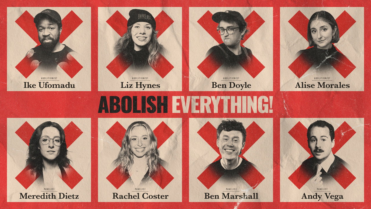 On Abolish Everything!, comedian-abolitionists roast a pet peeve they want banned from society, while a panel of improvisers dubbed “The Political Establishment” argue on behalf of the status quo. The audience chooses their champion each episode, each of whom will come back to compete in the season finale.